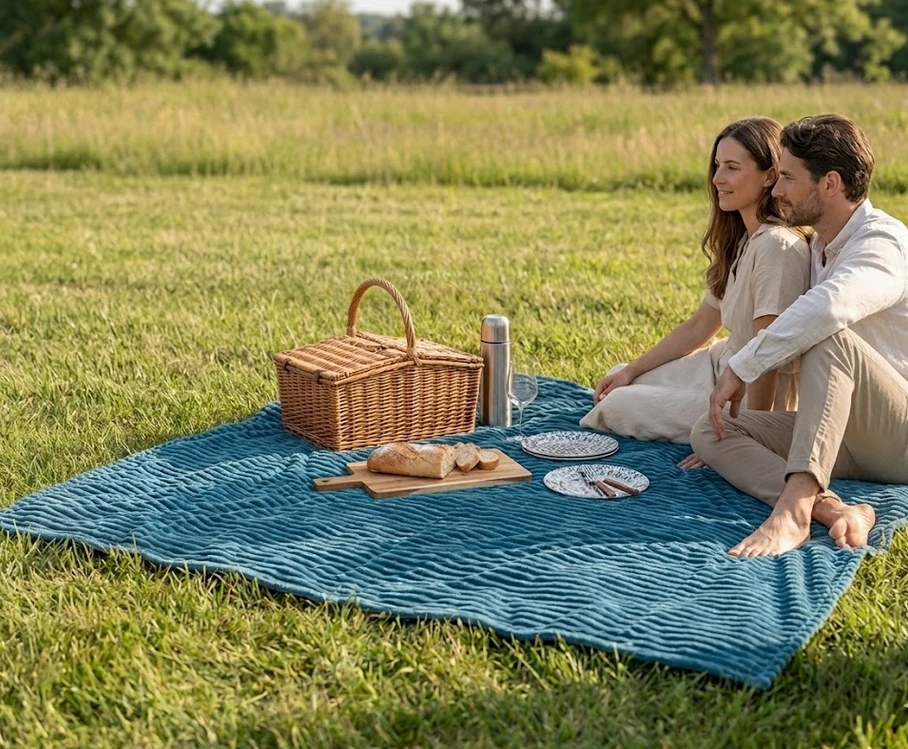 Idealny na Piknik: Dzięki ogromnej powierzchni, jest to wymarzony koc na piknik. Pomieści wszystkich domowników i przekąski, zapewniając miękkie, puszyste podłoże na trawie.