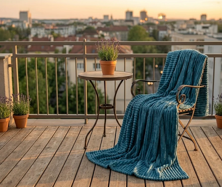 Na Taras i Balkon: Niebieski kolor pięknie odbija naturalne światło i świetnie komponuje się z jasnymi meblami ogrodowymi. To idealne okrycie na chłodniejsze letnie wieczory.