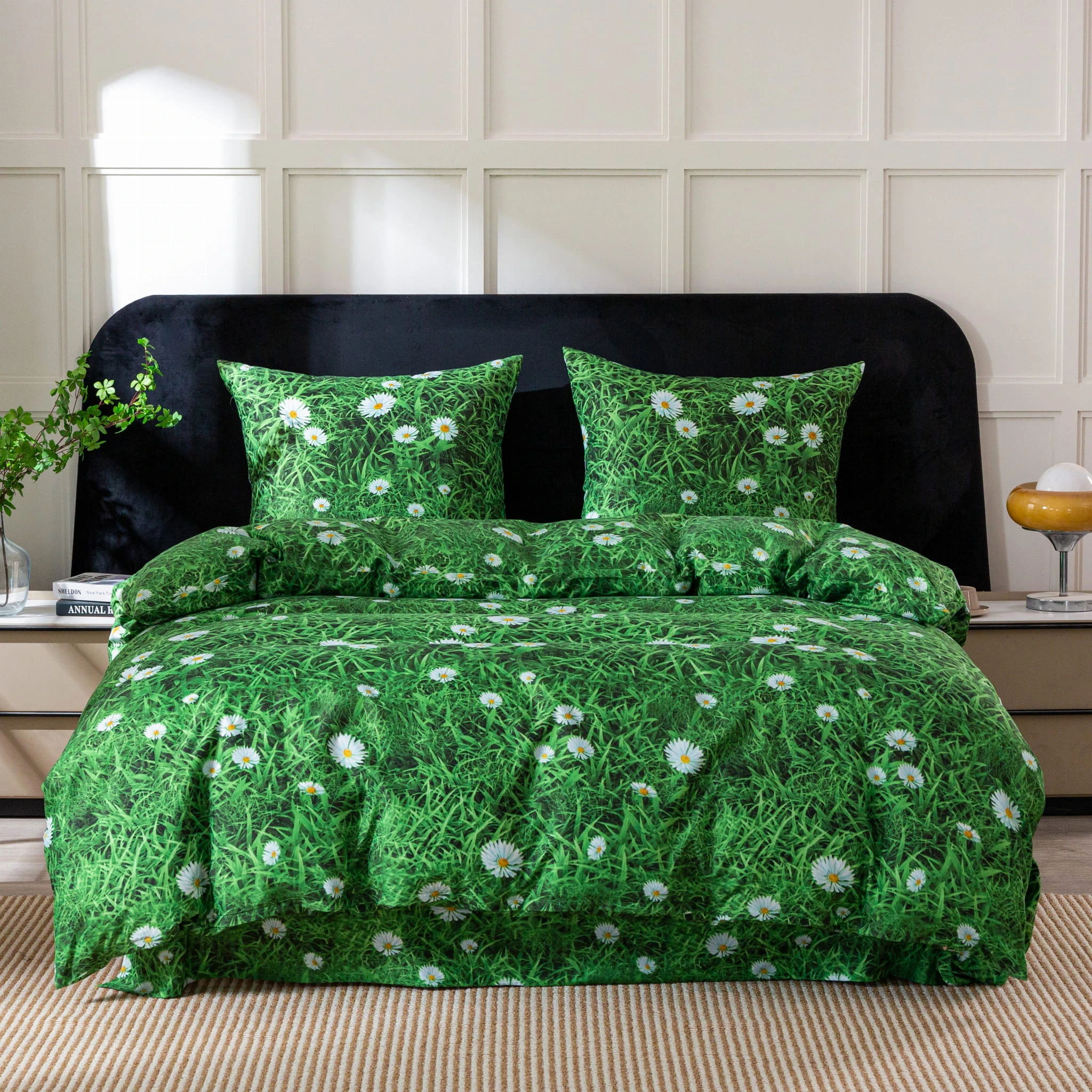 Pościel została wykonana z nowoczesnego mikrowłókna o wysokiej gęstości, które idealnie eksponuje głębię zieleni i czystość bieli stokrotek. Wybierając ten zestaw, zyskujesz: