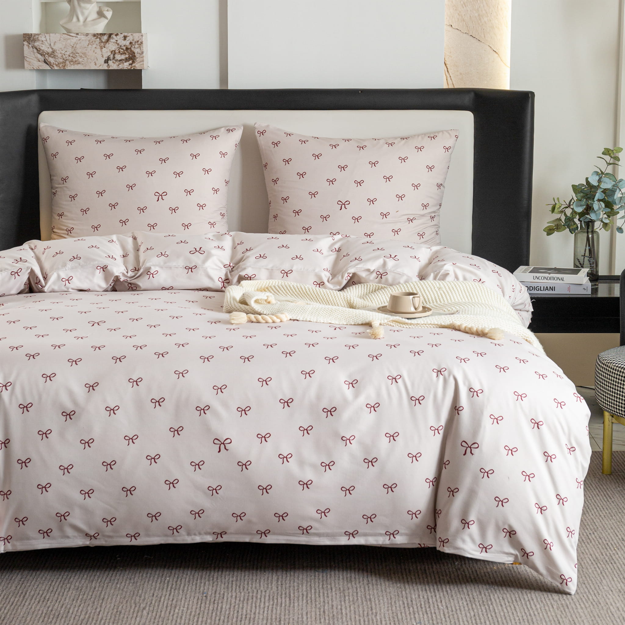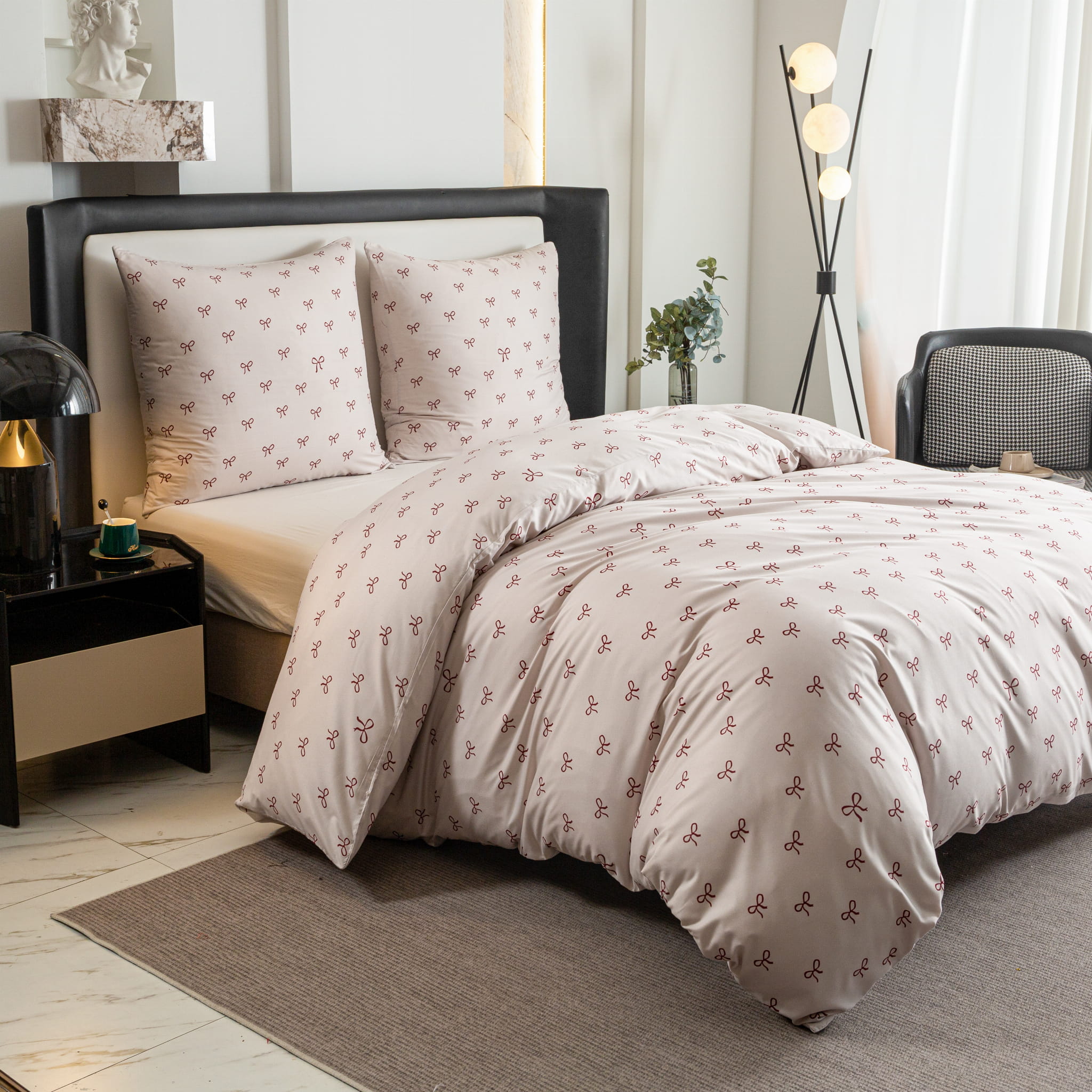 Porada od CottonMarket: Pościel w kokardki najlepiej prezentuje się w jasnych sypialniach z białymi meblami i tekstyliami w odcieniach pudrowego różu lub szarości. Aby stworzyć wyjątkowo przytulny kącik, zestaw ją z prześcieradłem w kolorze białym lub jasnoróżowym. Dodanie kilku miękkich, gładkich poduszek dekoracyjnych dopełni całości i uczyni Twoje łóżko najbardziej stylowym meblem w domu.