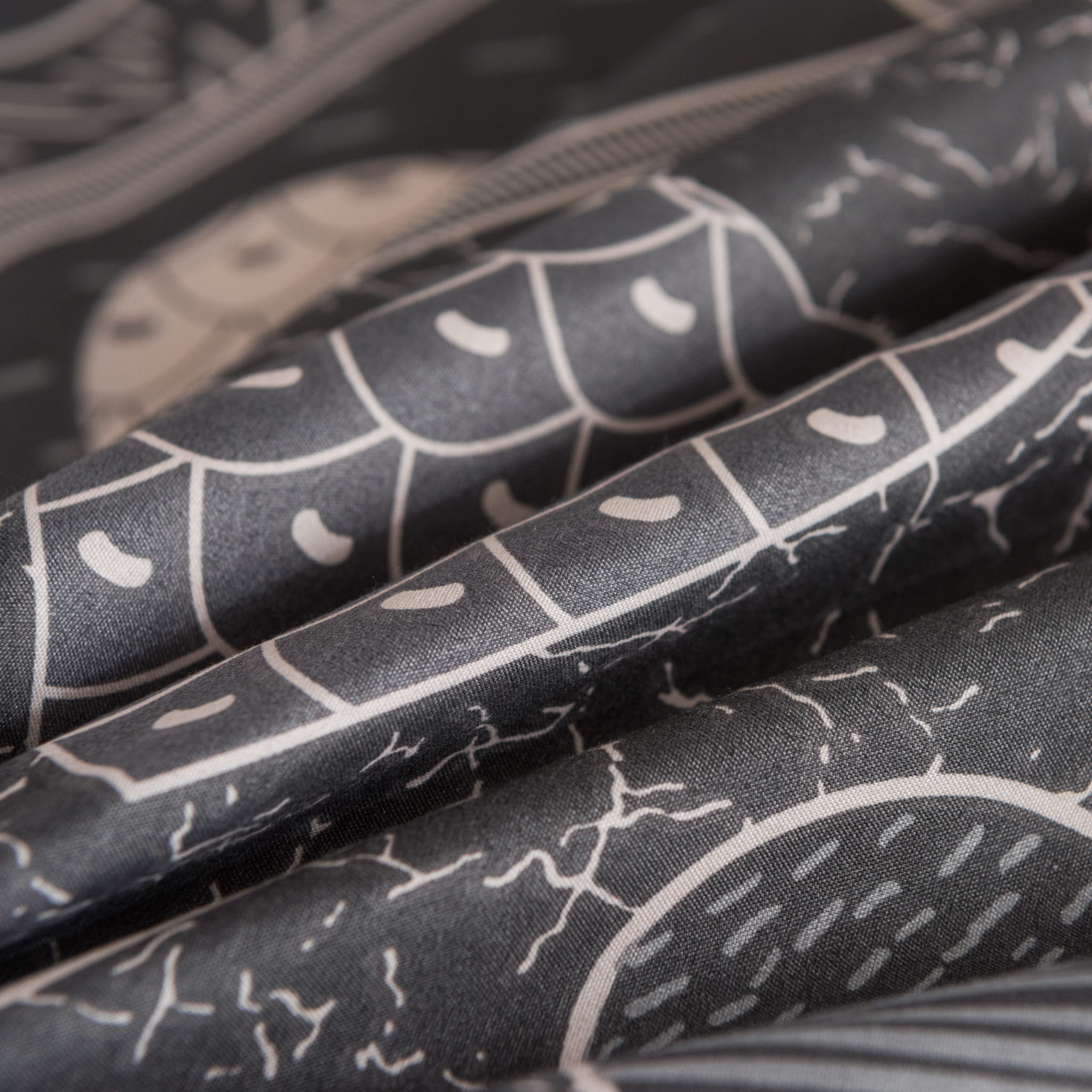 Porada od CottonMarket: Ciemnoszara pościel z kolorowymi akcentami świetnie wygląda w towarzystwie gładkich prześcieradeł w kolorze białym lub szarym. Jeśli chcesz podkreślić nowoczesny styl, dodaj lampki typu "cotton balls" w kolorach nawiązujących do serduszek na wzorze.