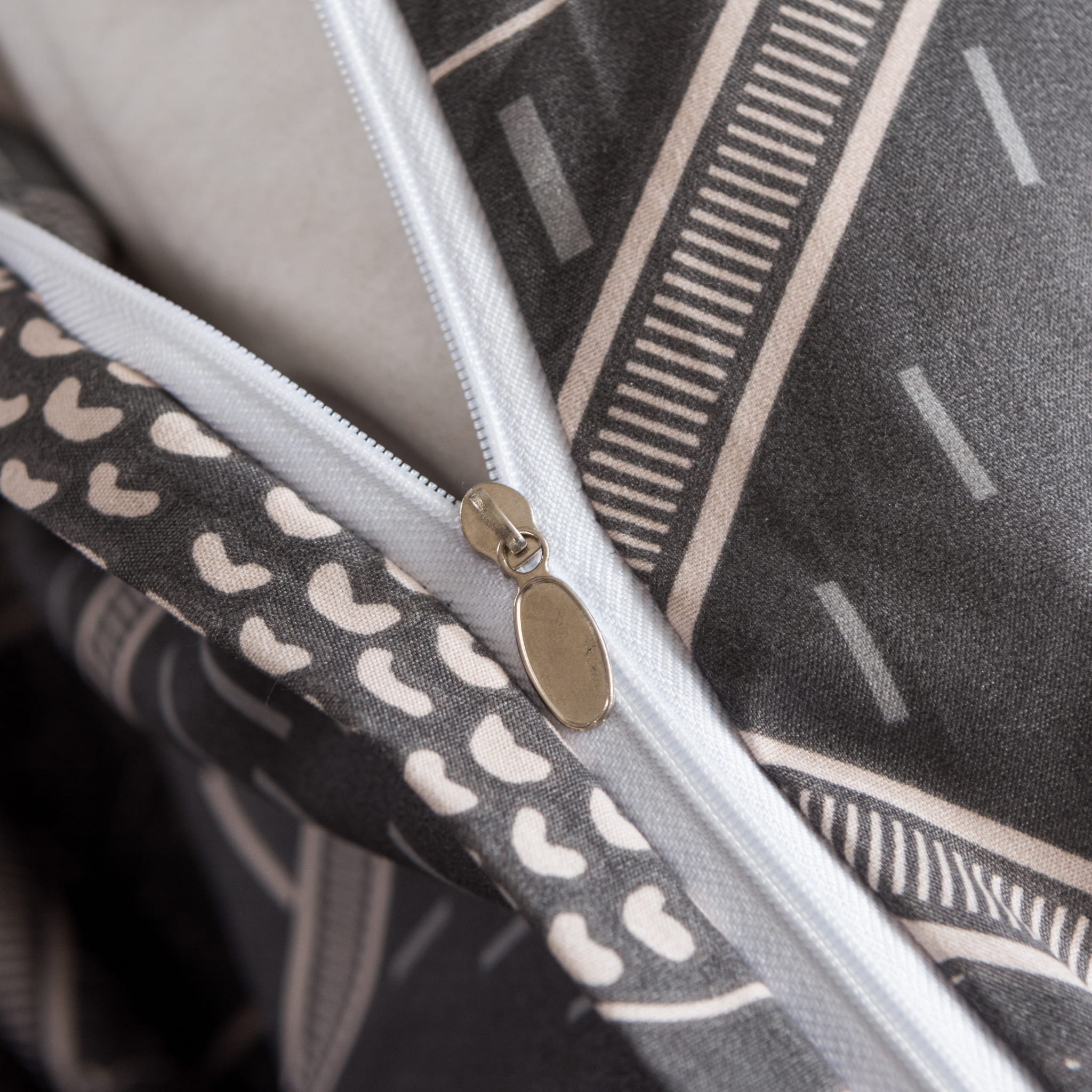 Wygodne zapięcie: Dyskretnie wszyte zamki błyskawiczne pozwalają na błyskawiczną zmianę poszewek, nie zaburzając geometrycznego wzoru.