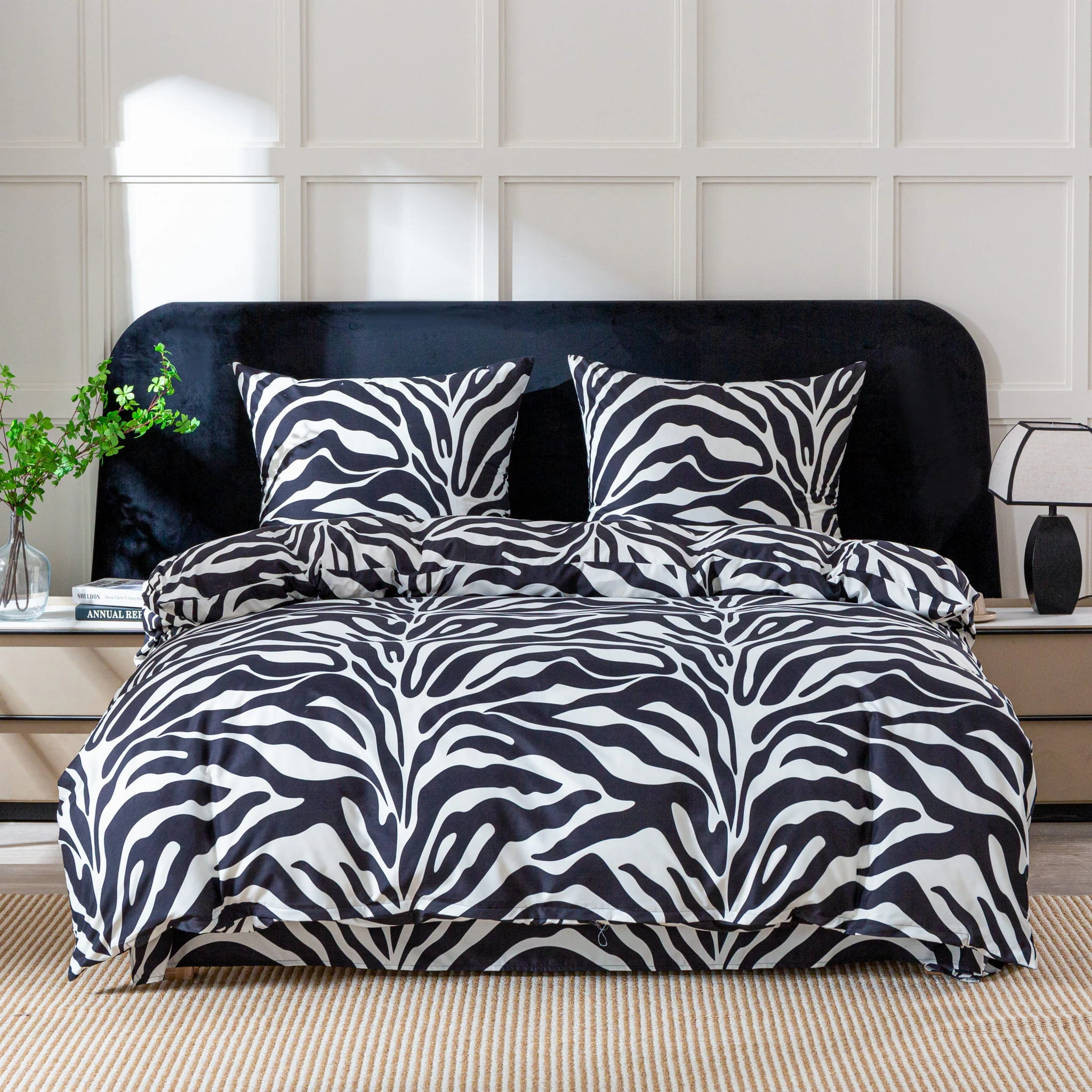 Porada od CottonMarket: Pościel w zebrę 140x200 najlepiej prezentuje się w towarzystwie dodatków w kolorze czarnym lub białym. Przy zestawie z dwiema poduszkami możesz pokusić się o ułożenie ich kaskadowo, co nada łóżku hotelowego sznytu. Aby stworzyć spójną i elegancką aranżację, dobierz prześcieradło w kolorze klasycznej czerni – idealnie podkreśli ono dziki charakter wzoru!